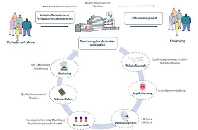 The identification of risky steps in the routine medication process for which customised measures and solutions are developed, implemented, evaluated and ultimately successfully consolidated in routine care in the specific BEDSIDE, BENCH and MANUFACTURING departments is central to this.