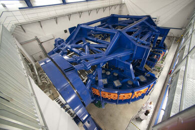 7 Gantry: Mit der drehbaren Strahlführung kann der Therapiestrahl im optimalen Winkel auf den Patienten gelenkt werden. Die Gantry wiegt 670 Tonnen, wovon 600 Tonnen mit Submillimeterpräzision drehbar sind.