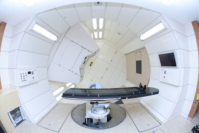 5 Behandlungsraum: Der Patient wird auf einem Bestrahlungstisch mithilfe eines computergesteuerten Roboters exakt in seine Bestrahlungsposition gebracht.