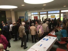 Sehr rege war auch der Besuch bei den fünfzehn Ausstellern. Dabei reichte das Spektrum von diversen Institutionen und verschiedenen Selbsthilfegruppen über die CI-Hersteller bis zu einem interessant gestalteten Stand mit Klangschalen, deren Wirkung die Besucher direkt ausprobieren konnten. Insgesamt hatten die Teilnehmer bei diesem Angebot an Ständen umfangreiche Gelegenheit, sich über die unterschiedlichen Hilfen bei Hörschädigung zu informieren. In den Vortragspausen wurden an den zahlreichen Tischen bei wechselnden Angeboten an Speisen und Getränken viele Gelegenheiten zum Gedankenaustausch wahrgenommen.