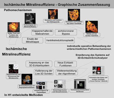 Eine multivariate Analyse der verschiedenen pathogenetischen Faktoren der ischämischen Mitralklappeninsuffizienz, welche mit den neuen 3D Verfahren bestimmt wurden und der verschiedenen operativen Maßnahmen wird in Bezug auf die funktionellen und strukturellen Ergebnisse in den verschiedenen Patientengruppen (nach unterschiedlichen, spezifischen Fragestellungen geordnet) durchgeführt. Ziel ist, das operative Verfahren auszuwählen, welches bei einem bestimmten vorliegenden Pathomechanismus der Mitralklappeninsuffizienz die besten Ergebnisse liefert. Bisher wurden die unterschiedlichen Pathomechanismen nur getrennt in klinischen und experimentellen Studien untersucht. In unserer Studie wird es im klinischen Bereich erstmals möglich sein, eine differenzierte Zuordnung der funktionellen und strukturellen Ergebnisse der verschiedenen operativen Verfahren zu den unterschiedlichen, komplexen Pathomechanismen der ischämischen Mitralklappeninsuffizienz vorzunehmen.