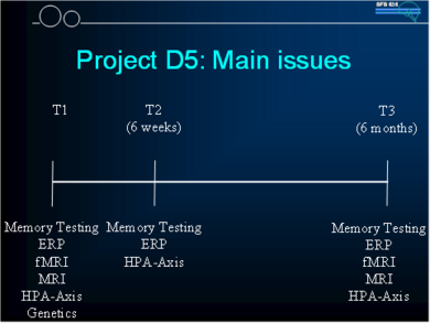 Zur funktionellen Untersuchung der deklarativen Gedächtnisfunktionen werden ereigniskorrelierter Potentiale (EKP; 64-Kanal-EEG) abgeleitet, eine funktionelle Kernspintomographie durchgeführt sowie peripherphysiologische Parameter analysiert. Das zeitliche Aktivierungsmuster wird dabei vor allem mittels der EKP dargestellt, die fMRT Untersuchung hingegen erfasst die räumlichen Aspekte der Aktivierung. Das Untersuchungsparadigma besteht in einer sogenannten Trace-Konditionierung, einem spezifischen Lernparadigma, das eine Hirnaktivierung im Rahmen von spezifisch deklarativen Gedächtnisprozessen abzubilden vermag. Zusätzlich werden strukturelle Aufnahmen des Gehirns mittels Kernspintomographie durchgeführt. Diese Untersuchungen werden in einem Follow-up-Design in gleicher Weise wiederholt, um entsprechende Veränderungen struktureller und/oder funktioneller Art im Verlauf der Depression. Parallel hierzu werden die deklarativen und impliziten Gedächtnisleistungen neuropsychologisch untersucht.