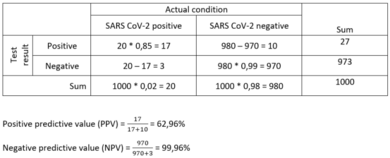We again consider a city with 1000 inhabitants and a SARS CoV-2 incidence of 2%. An exemplary test has a sensitivity of 85% and a specificity of 99%.
