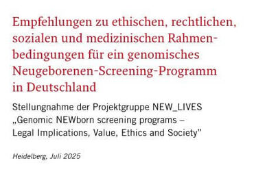 Following the symposium to present an ethical, legal, societal and medical framework for a possible future genomic newborn screening program (July 18, 2025, Heidelberg, Marsilius-Kolleg), the project results were reported in the press. We have compiled a selection of the press coverage for you here, in which members of the project group (including Prof. Eva Winkler, and Karla Alex, Ethics; Prof. Ralf Müller-Terpitz, Law; Prof. Ulrike Mütze, Paediatrics; Prof. Christian Schaaf, and Dr Nicola Dikow, Genetics), also have their say.