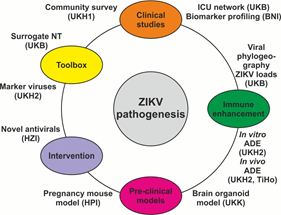 This includes clinical-epidemiological studies in Brazil raising data on the ZIKV infection burden (Tropical Medicine, Heidelberg University Hospital, UKH1) and identifying severe cases of ZIKV disease (Virology, University of Bonn Medical Centre, in collaboration with Brazilian partners, UKB). The in vivo interplay between DENV and ZIKV infection will be investigated by generating novel tools to investigate the flaviviral serostatus and by the genetic characterization of DENV circulating before the arrival of ZIKV in different Brazilian regions (Virology, University of Bonn Medical Centre, UKB). ADE mediated by sera from these Brazilian regions will be investigated experimentally using different in vitro and in vivo models for ZIKV and DENV, including cell culture- and organoid-based models (Molecular Virology, Heidelberg University Hospital, UKH2; Microbiology/Immunology, University of Cologne, UKK), IFNAR (UKH2) and immunocompetent pregnancy mouse models (Heinrich Pette Institute for Experimental Virology, Hamburg), as well as in non-human primates (University of Veterinary Medicine, Hannover, TiHo). Finally, a novel antiviral tool to combat ZIKV infection will be tested in vitro and in vivo in the pre-clinical models developed in this project (Helmholtz Centre for Infection Research, Braunschweig, HZI).