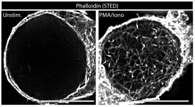 The astonishing dynamics of the actin cytoskeleton provides the basis for fundamental processes in mammalian cells such as motility, kinesis, vesicular transport and signal transduction. While mechanisms and function of actin dynamics in the cytoplasm are relatively well studied, an only recently emerging field is the role of actin dynamics in the nucleus. We recently identified the rapid and transient formation of nuclear actin filaments as novel effector function of T cell receptor stimulation in CD4 T lymphocytes. Mediated by calcium transients in the nucleus and nuclear pools of the actin polymerization machinery Arp2/3 complex, the presence of nuclear filaments facilitates expression of a selected set of genes required for CD4 T helper function. Our current efforts aim at characterizing the mechanisms governing these nucleus-specific actin polymerization event as well as at dissecting the relationship between nuclear actin dynamics and gene expression.