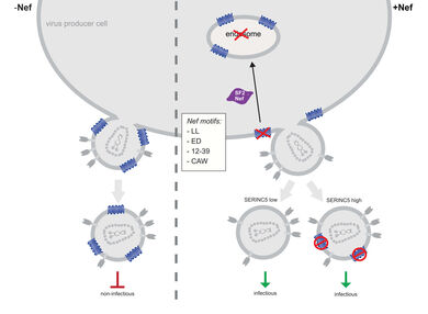 SERINC3 and 5 were recently identified as host cell restriction factors that potently suppress the infectivity of HIV‑1 virions. This antiviral activity can be counteracted by the HIV‑1 protein Nef. We are studying the mechanisms underlying the antiviral action of SERINC proteins as well as its antagonism by Nef.