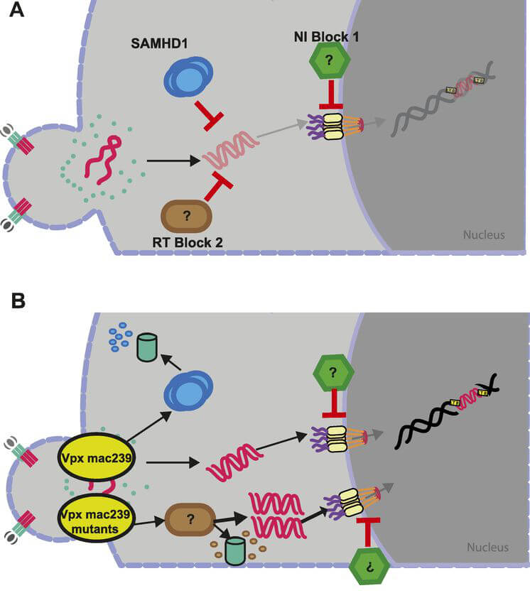 HIV‑1 infects CD4+ T lymphocytes and cells of the monocytes/macrophage lineage. In the case of primary human CD4+ T lymphocytes, the permissivity to HIV‑1 infection ex vivo depends on the cellular activation state: while activated, proliferating CD4+ T lymphocytes are highly susceptible to infection and support efficient virus replication, resting CD4+ T cells are largely non-permissive for HIV‑1 replication but can be infected in vivo and serve as a latent viral reservoir. Since physiologically the vast majority of all CD4+ T lymphocytes are in a resting state, this phenomenon provides one explanation as to why the frequency of productively infected CD4+ T lymphocytes in AIDS patients is very low. In collaboration with Prof. Dr. Oliver T. Keppler (LMU Munich) we identified the deoxynucleoside triphosphate (dNTP) triphosphohydrolase SAMHD1 (sterile alpha motif (SAM) and histidine/aspartic acid (HD) domain-containing protein 1) as an essential host cell factor for this restriction that can be overcome by the Vpx protein encoded by HIV‑2 and SIV and defined additional resting T cell-specific blocks at the level of reverse transcription and nuclear import. Our current efforts focus on defining the nature of these additional blocks to HIV‑1 replication in resting CD4+ T cells.