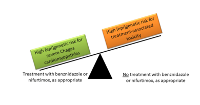 Chagas disease is a potentially fatal illness caused by the parasite Trypanosoma cruzi. There are more than 6 million people infected worldwide, mainly in endemic areas of Latin America, but also increasingly in Europe due to migration and travel. Recent achievements in Chagas prevention include a better control of vector, and a substantial reduction of infections via blood transfusion and mother to child transmission. However, enhanced treatment of millions of infected people remains a key challenge. Infected persons can be treated with benznidazole (BZ) or nifurtimox (NFX). BZ and NFX show close to 100% effectivity in killing the parasite shortly after infection, but efficacy sharply decreases with post infection time. This decline in effectivity represents an important limitation because symptoms are often absent or unspecific during the initial, acute phase of Chagas disease. Treatment may be indicated during the chronic phase to prevent disease progression reducing risk of cardiac, digestive and neurological complications, but treatment is also accompanied by adverse reactions, which occur in up to 40% of treated patients. A personalized treatment of Chagas disease based on the (epi)genetic makeup of patients and parasites would permit to optimize the benefit-risk ratio of chronic infected patients, simultaneously reducing treatment costs.