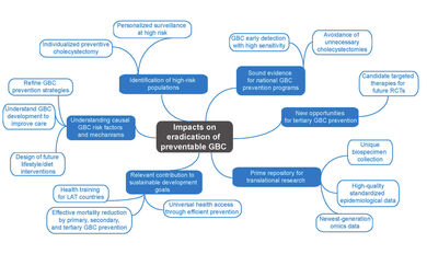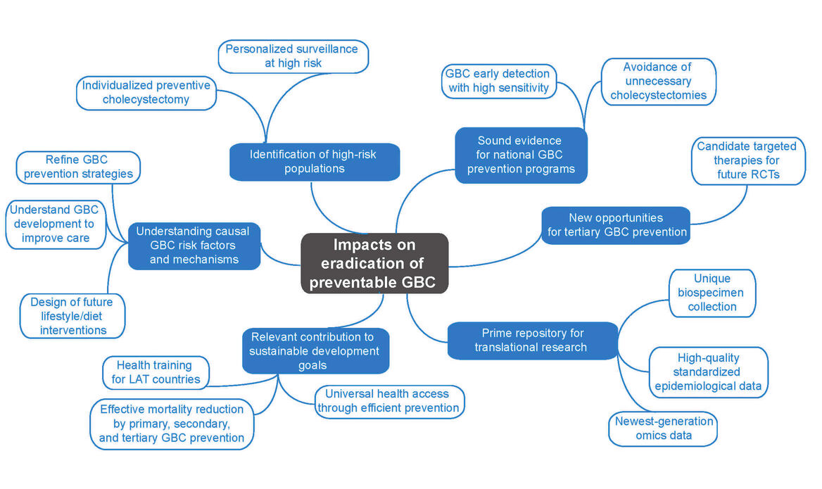 Gallbladder cancer (GBC) is a neglected disease with huge potential for prevention. This project aims at significantly improving the accuracy of risk estimation and early detection of GBC by identifying and adequately considering geographical, environmental, lifestyle, ethnic, gender and molecular differences. We plan to generate the information needed to establish and refine current prevention programmes, including the primary, secondary and tertiary prevention of GBC. We will (1) build a unique European–Latin American GBC biorepository integrated into a tailored IT platform, (2) identify, validate and functionally characterize novel GBC biomarkers, (3) develop a multifactorial risk score that integrates established and newly identified epidemiological and molecular risk factors, (4) improve the understanding of the causal mechanisms that link lifestyle, cultural and behavioural factors to GBC development, (5) unravel novel opportunities for the targeted therapy of incidental GBC, (6) exploit existing and newly generated epidemiological and multi-omics data to improve the accuracy of GBC risk prediction and (7) contribute to the training of the next generation of Latin American researchers in precision medicine for GBC. The generated information will permit identification of individuals at high GBC risk, guiding surveillance and individual decisions on the possible benefit of preventive gallbladder removal in regions of low and high GBC incidence. Novel data on genomic alterations in incidental GBC will pave the way towards implementation of future clinical trials. The planned European–Latin American GBC biorepository and IT platform will constitute a prime resource for translational research on individualized prevention, personalized early detection and targeted therapy of GBC. The participation in our project of representatives of health authorities, patients and the industry guarantees the efficient incorporation of project results into national health policies.