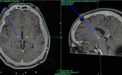 Für die Operation der Tiefen Hirnstimulation wird die sogenannte rahmenbasierte Stereotaxie als hochpräzises, bildunterstütztes Verfahren angewandt.