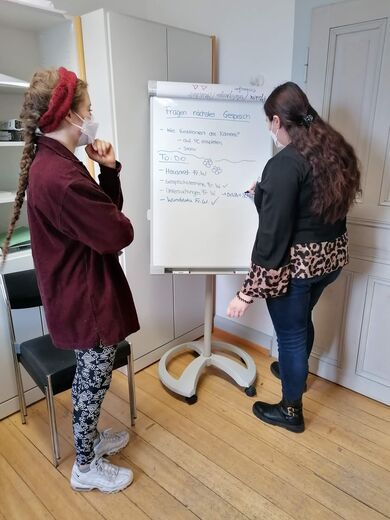 Tamara Dehn: Wir haben einen festen Wochenplan. Jede Woche ist gleich, aber jeder Tag anders. In unserem gemeinsamen Büro gehen wir morgens den Tagesplan durch. Wir haben regelmäßig Termine mit unseren Lernbegleitern, die uns engmaschig betreuen und zur fachlichen Unterstützung zur Seite stehen. Wir können also selbstständig arbeiten, werden aber nie alleine gelassen. Nina und ich leiten außerdem eine Infogruppe. Hier geben wir den PatientInnen Werkzeuge an die Hand, um sich selbst besser zu verstehen. Zum Beispiel erklären wir was eine Depression ist.