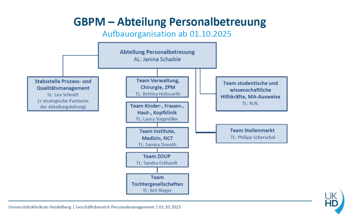 Die Personalbetreuung des Universitätsklinikums Heidelberg versteht sich als Dienstleistungsabteilung und ist Ansprechpartner für die Beschäftigten des Universitätsklinikums Heidelberg und der Tochtergesellschaften in allen Fragen des Arbeitsverhältnisses.