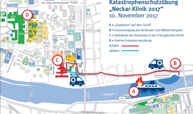 Eine Katastrophenschutzübung in diesem Ausmaß hatte es in Baden-Württemberg bisher noch nicht gegeben: Mitte November übten in Heidelberg über 400 Teilnehmer aus neun verschiedenen Organisationen und etwa 70 Patientendarsteller für den Ernstfall. Allein 240 der Teilnehmer waren Mitarbeiter des Universitätsklinikums – und zwar quer durch alle Berufsgruppen und Hierarchieebenen hinweg. Das Besondere: Die Übung fand an vier verschiedenen Orten – auf dem Neckar, der Neckarwiese sowie in der Chirurgischen Klinik und der Kopfklinik – statt und beinhaltete eine aufwändige und schwierige technische Rettung der Verletzten eines Schiffs. Für das Klinikum bedeutete insbesondere die Erprobung eines Massenanfalls von Verletzten (MANV) absolutes Neuland. Bei einer zeitgleich stattfindenden Übung in der Kopfklinik mussten 26 Personen von einer Station evakuiert werden. Hier waren 40 Mitarbeiter des Klinikums involviert.