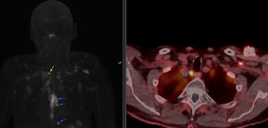 Abbildung: Links Projektion der PET-Avidität mit Markierung des Speiseröhrenkrebses (oberer blauer Pfeil) und Lymphknotenmetastasen (untere zwei blaue Pfeile). Der gelbe Pfeil im linken Bild zeigt die deutlich weiter kopfwärts aufgefallene Lymphknotenmetastase, rechts in der Fusion mit der CT dargestellt. Die differenzierte Ausbreitungsdiagnostik soll dabei unterstützen, die gesamte Tumorausdehnung während einer Strahlentherapie oder Operation zu berücksichtigen.