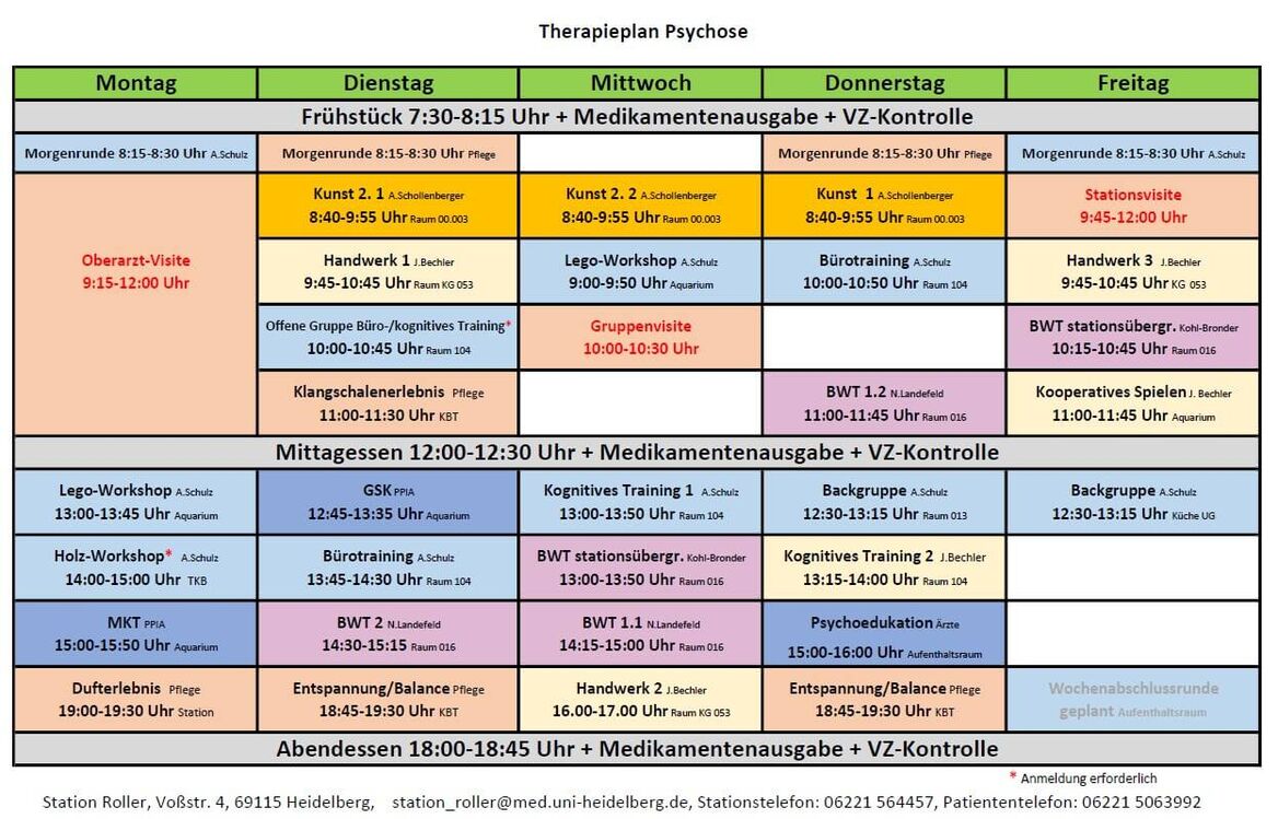 Einmal in der Woche findet eine Visite durch den Oberarzt der Station statt, bei welcher neben den Stationsärzten, die Bezugspflegekräfte der Patienten und auch der Sozialarbeiter anwesend sind. Im Rahmen dieser multiprofessionell besetzten Visite werden die mittel- bis langfristigen Therapieziele und gegebenenfalls auch Änderungen der Behandlungsstrategie thematisiert.