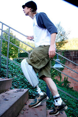 Der Patient auf dem Foto kann sogar mit den Prothesen und einer Gehstütze die Treppe herunter gehen. Diese Leistung ist nur mit sehr viel Übung, eisernem Willen und nur wenigen Prothesenkniegelenken möglich.