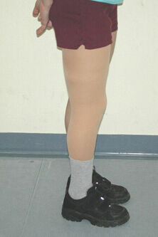 Diese Abbildung zeigt eine schwarze zweiteilige Kosmetik, die wir auf Wunsch eines jungen Mannes angefertigt haben. Im Gegensatz zur einteiligen Schaumkosmetik beeinträchtigt die zweiteilige Kosmetik nicht die Bewegungen im Kniegelenk.