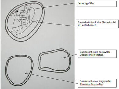 Aus dem Vergleich der Oberschaftformen (s. obige Abb.) wird deutlich, dass ein querovaler Schaft die Weichteile erheblich stärker verformt als ein längsovaler Schaft. Denn dieser orientiert sich mehr an den anatomischen Gegebenheiten. Es handelt sich in der Abbildung jeweils um das rechte Bein bzw. um einen rechten Schaft. Vor allem die Femoralgefäße werden bei dem querovalen Schaft stark komprimiert, was sich negativ auf die Durchblutung auswirkt.