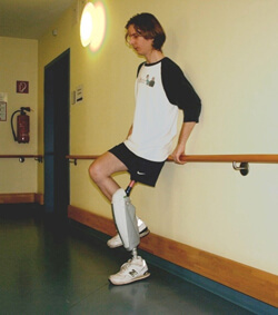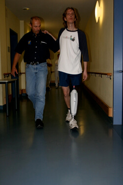 Nach etwa 4 bis 6 Wochen ist Ihr Stumpf soweit, mit einer Interimprothese die ersten Steh- und Gehversuche zu unternehmen. Eine Interimprothese ist eine modulare Konstruktion mit einem Schaft, der mit wenig Aufwand verändert werden kann. Eine solche Vorabkonstruktion ist erforderlich, weil sich Ihr Stumpf auch jetzt noch und vor allem durch die Einwirkung der Prothese weiter verändert. Außerdem dient die Interimprothese dazu, unterschiedliche Bauteile wie Kniegelenk und Fuß zu testen, um bei der Definitivprothese die für Sie bestmögliche Kombination einsetzen zu können.