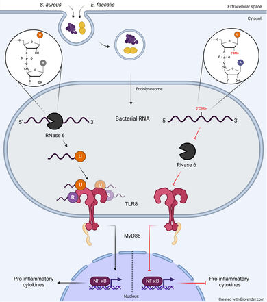 Cells of the innate immune system recognize conserved microbial structures, so called pathogen-associated molecular patterns (PAMPs) by pattern recognition receptors. Among these receptors Toll-like receptors (TLR) 3, -7, -8, -9 and -13 recognize nucleic acids of viral, bacterial or synthetic origin. However, the exact mechanisms of nucleic acid recognition and the differentiation between foreign (dangerous) and self (usually harmless) are still only known partially. Work of our own could show (1) that bacterial RNA represents a PAMP recognized by various immune cells. We could also show that TLR13 is a murine receptor for bacterial RNA. (2) We work onposttranscriptional RNA modifications and their role role for self/non-self discrimination. We identified 2’-O-methylation as a modification that inhibits TLR7 and 8 stimulation. This naturally occurring RNA modification can be regulated under stress within bacteria thus potentially contributing to immune evasion. (3) Recent projects analyze the role of RNases in the process of TLR8 stimulation, as the receptor is activated by RNA breakdown products instead of full length RNA. We show that RNA processing by RNase6 is a prerequisite and critical for RNA-TLR interactions in monocytes. Of note, RNA modifications and RNA degradation act together. An ongoing project addresses the importance of RNase 7 for RNA recognition in the interplay of skin cells and monocytes.