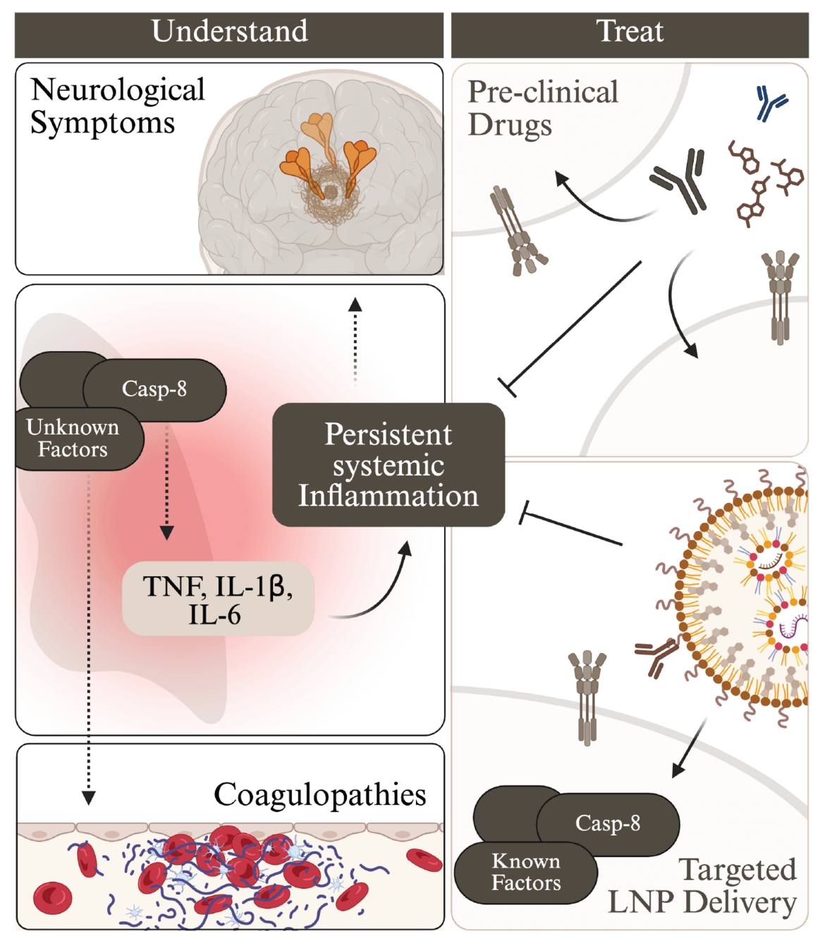 By integrating experimental preclinical data with clinical collaborations, we connect molecular signatures of immune dysregulation to patient outcomes, enabling the identification of biomarkers and therapeutic targets for post-viral diseases. Our work also explores host-directed and RNA-based strategies to precisely modulate key pathways involved in chronic inflammation, while maintaining essential immune functions. This includes both the repurposing of clinical-stage compounds and the development of lipid nanoparticle (LNP)-mediated RNA delivery systems for targeted therapeutic intervention.