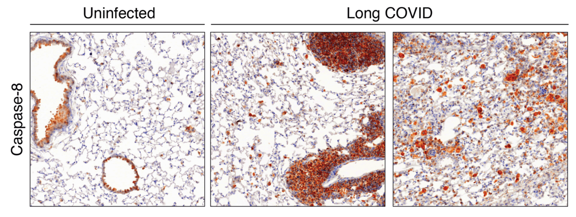 During acute SARS-CoV-2 infection, we have shown that the cell death protein caspase-8 is diverted from its canonical apoptotic function to instead propagate inflammatory signalling. Caspase-8 accumulates in the lung during infection and remains dysregulated for months after viral clearance (Figure 1). Our current work aims to uncover the molecular mechanisms underlying this sustained imbalance by identifying the signalling nodes that remain aberrantly activated and contribute to long-term disease. Using integrated transcriptomic, proteomic, and high-resolution imaging approaches in vivo, we map the networks that maintain chronic inflammation and investigate how they may be precisely modulated to restore immune balance and promote tissue repair.