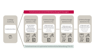 Am Ende Ihrer stationären/teilstationären Behandlung findet der erste Untersuchungstermin statt und Sie werden zufällig einer Studiengruppe zugeteilt. Als Teilnehmer*in in der Gruppe mit optimierter herkömmlicher Behandlung (TAU-O) unterstützen wir Sie bei der Suche nach einer ambulanten psychotherapeutischen Weiterbehandlung. Teilnehmer*innen der SUSTAIN-Behandlungsgruppe erhalten die Weiterbehandlung direkt über unsere Abteilung. Sie erhalten 20 Therapiesitzungen der SUSTAIN-Behandlung. An vier Untersuchungsterminen über den gesamten Studienverlauf werden über körperliche Untersuchungen, Interviews und Fragebögen der Verlauf der Essstörung sowie weitere Gesundheitsparameter erfasst.