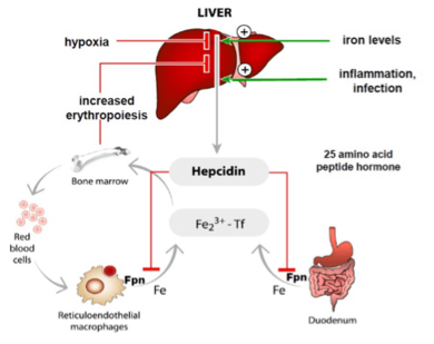 High hepcidin levels, that arise as a consequence of iron overload or inflammation prevent excess iron absorption from the diet and iron release from macrophages that recycle iron from aging red blood cells. Low hepcidin levels are observed when iron supplies are low and insufficient iron is available for red blood cell synthesis. As a consequence, increased amounts of iron are taken up from the diet.